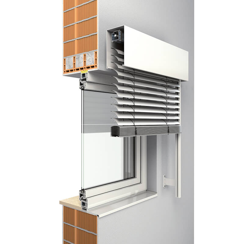 Die Raffstorensysteme von ROMA sind aus hochwertigem Aluminium gefertigt und sitzen als kompakte Anlage vor dem Fenster. Mit unterschiedlichen Lamellenprofilen sowie vielen technischen Zusätzen helfen Raffstoren dabei, ein angenehmes Raumklima zu schaffen und den Lichteinfall der jeweiligen Raumnutzung angemessen zu steuern.